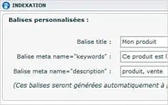 Les balises title, description et keywords sont paramétrables sur chaque page et sur chaque fiche produit.